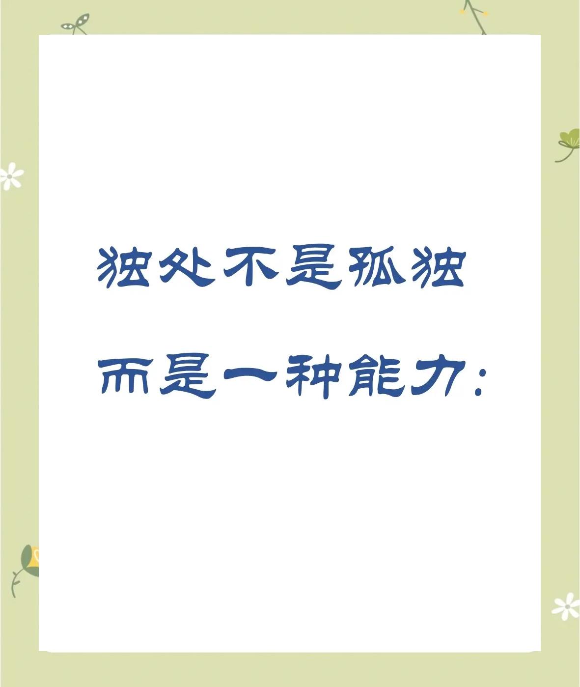 独处是一种能力,具备这种能力并不是感觉不到孤独,而是在孤独时也懂得打磨自己。在忙碌的生活中,不妨给自己留一些独处的时间,把外界的喧嚣关在门外,将孤独当作自己的朋友。——人民日报